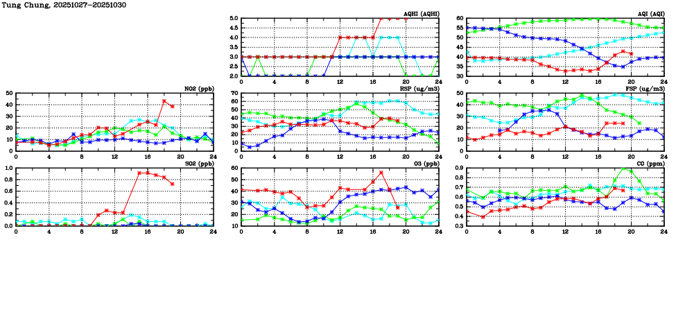 | Air Quality Data Time Series in Tung Chung (2025/10/30) | ( Line colors: Day -3 Day -2 Day -1 Current day ) | 2D Map Current AQHI |