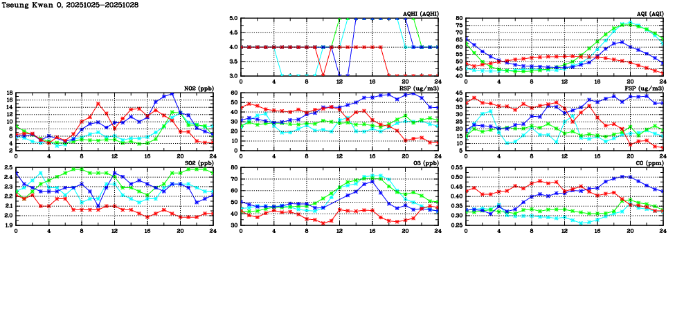 | Air Quality Data Time Series in Tseung Kwan O (2025/10/28) | ( Line colors: Day -3 Day -2 Day -1 Current day ) | 2D Map Current AQHI |