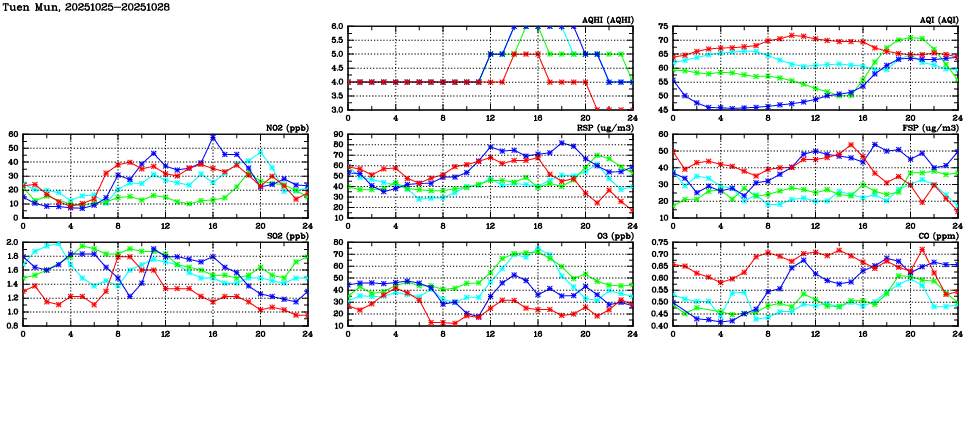 | Air Quality Data Time Series in Tuen Mun (2025/10/28) | ( Line colors: Day -3 Day -2 Day -1 Current day ) | 2D Map Current AQHI |