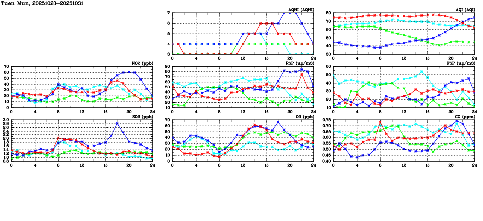 | Air Quality Data Time Series in Tuen Mun (2025/10/31) | ( Line colors: Day -3 Day -2 Day -1 Current day ) | 2D Map Current AQHI |