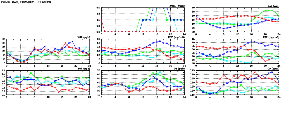 | Air Quality Data Time Series in Tsuen Wan (2025/10/28) | ( Line colors: Day -3 Day -2 Day -1 Current day ) | 2D Map Current AQHI |