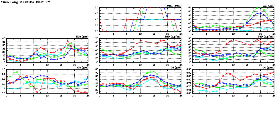 | Air Quality Data Time Series in Yuen Long (2025/10/27) | ( Line colors: Day -3 Day -2 Day -1 Current day ) | 2D Map Current AQHI |