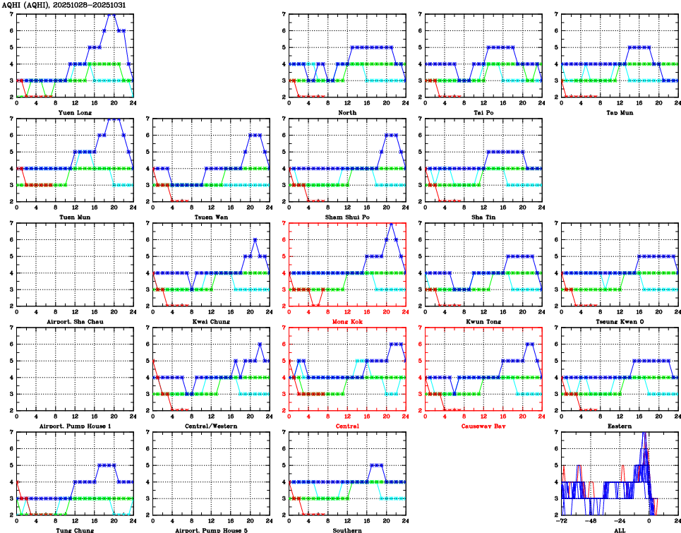 | Air Quality Data Time Series for AQHI (2025/10/31) | ( Line colors: Day -3 Day -2 Day -1 Current day ) | 2D Map Current AQHI |