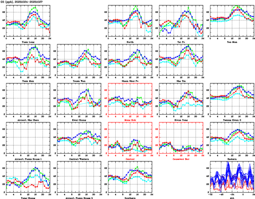 | Air Quality Data Time Series for O3 (2025/10/27) | ( Line colors: Day -3 Day -2 Day -1 Current day ) | 2D Map Current AQHI |
