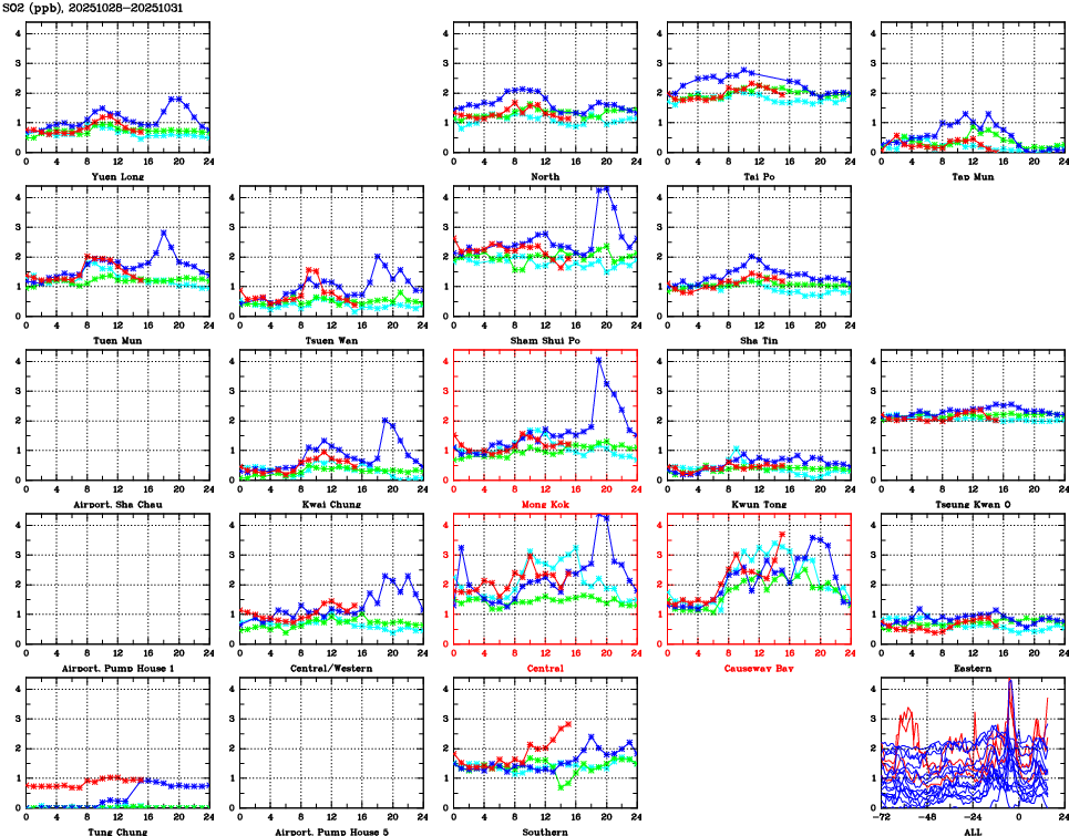 | Air Quality Data Time Series for SO2 (2025/10/31) | ( Line colors: Day -3 Day -2 Day -1 Current day ) | 2D Map Current AQHI |