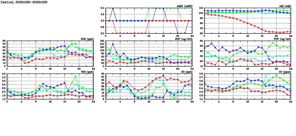 | Air Quality Data Time Series in Central (2025/10/29) | ( Line colors: Day -3 Day -2 Day -1 Current day ) | 2D Map Current AQHI |