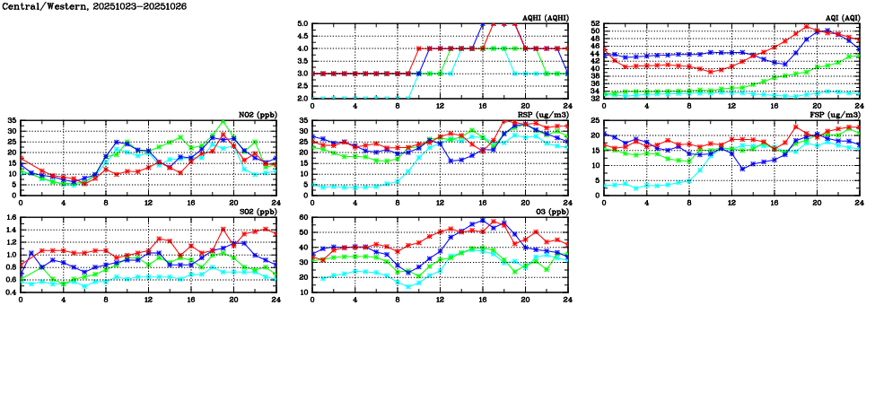 | Air Quality Data Time Series in Central/Western (2025/10/26) | ( Line colors: Day -3 Day -2 Day -1 Current day ) | 2D Map Current AQHI |