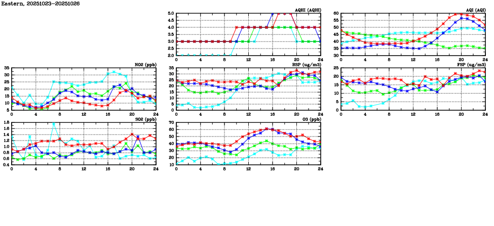 | Air Quality Data Time Series in Eastern (2025/10/26) | ( Line colors: Day -3 Day -2 Day -1 Current day ) | 2D Map Current AQHI |