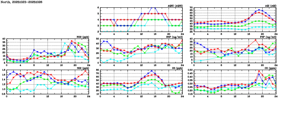 | Air Quality Data Time Series in North (2025/10/26) | ( Line colors: Day -3 Day -2 Day -1 Current day ) | 2D Map Current AQHI |