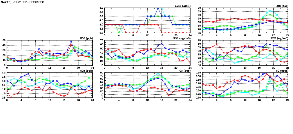 | Air Quality Data Time Series in North (2025/10/28) | ( Line colors: Day -3 Day -2 Day -1 Current day ) | 2D Map Current AQHI |