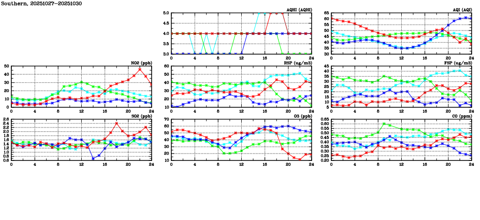 | Air Quality Data Time Series in Southern (2025/10/30) | ( Line colors: Day -3 Day -2 Day -1 Current day ) | 2D Map Current AQHI |