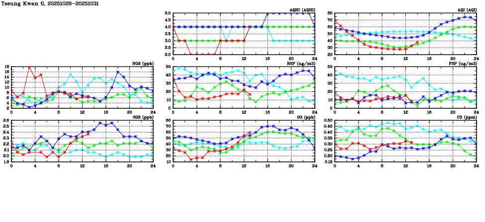 | Air Quality Data Time Series in Tseung Kwan O (2025/10/31) | ( Line colors: Day -3 Day -2 Day -1 Current day ) | 2D Map Current AQHI |