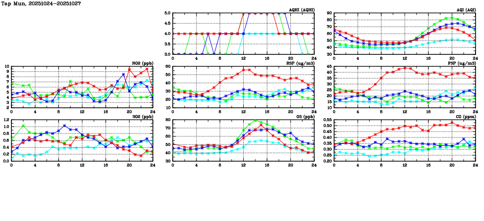 | Air Quality Data Time Series in Tap Mun (2025/10/27) | ( Line colors: Day -3 Day -2 Day -1 Current day ) | 2D Map Current AQHI |