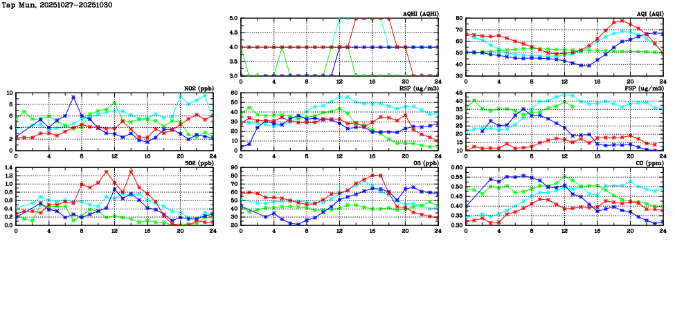 | Air Quality Data Time Series in Tap Mun (2025/10/30) | ( Line colors: Day -3 Day -2 Day -1 Current day ) | 2D Map Current AQHI |