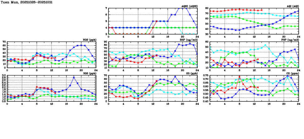 | Air Quality Data Time Series in Tuen Mun (2025/10/31) | ( Line colors: Day -3 Day -2 Day -1 Current day ) | 2D Map Current AQHI |