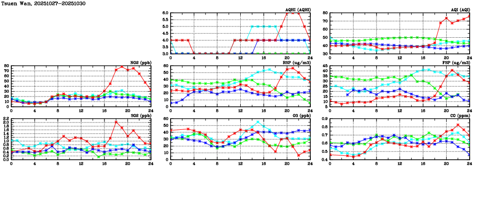 | Air Quality Data Time Series in Tsuen Wan (2025/10/30) | ( Line colors: Day -3 Day -2 Day -1 Current day ) | 2D Map Current AQHI |