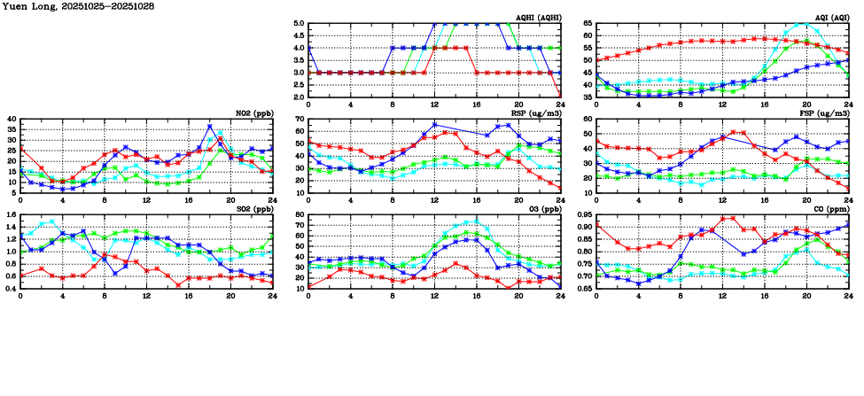 | Air Quality Data Time Series in Yuen Long (2025/10/28) | ( Line colors: Day -3 Day -2 Day -1 Current day ) | 2D Map Current AQHI |