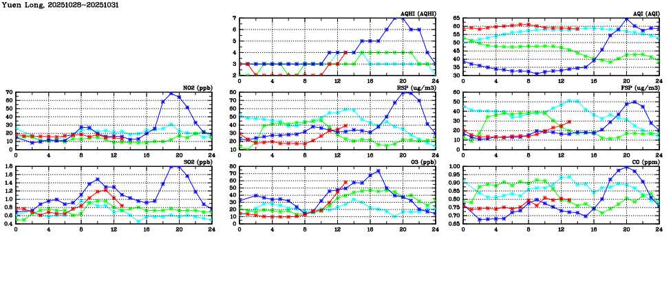 | Air Quality Data Time Series in Yuen Long (2025/10/31) | ( Line colors: Day -3 Day -2 Day -1 Current day ) | 2D Map Current AQHI |