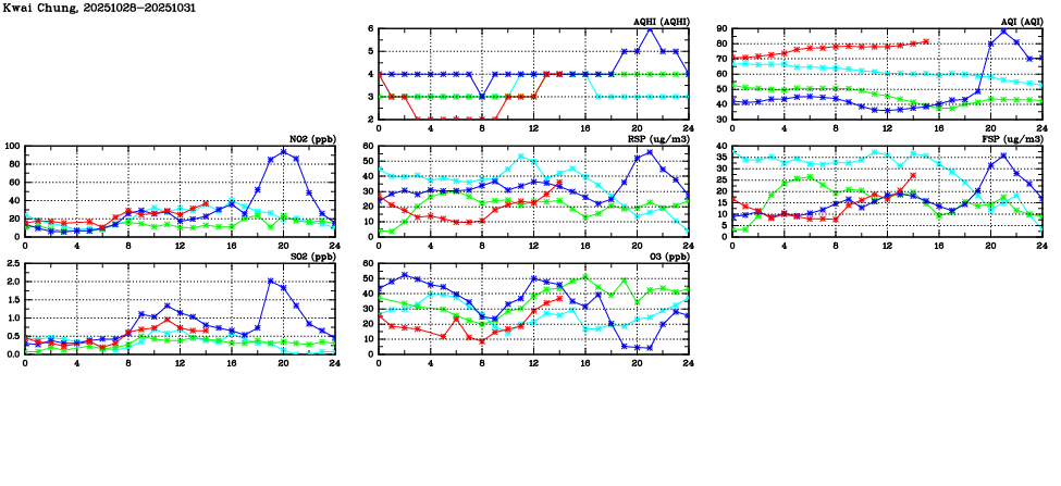 | Air Quality Data Time Series in Kwai Chung (2025/10/31) | ( Line colors: Day -3 Day -2 Day -1 Current day ) | 2D Map Current AQHI |