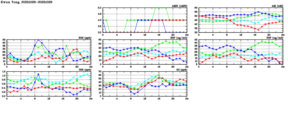 | Air Quality Data Time Series in Kwun Tong (2025/10/29) | ( Line colors: Day -3 Day -2 Day -1 Current day ) | 2D Map Current AQHI |