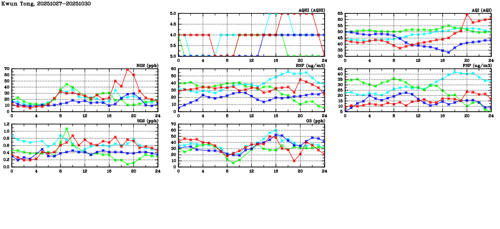 | Air Quality Data Time Series in Kwun Tong (2025/10/30) | ( Line colors: Day -3 Day -2 Day -1 Current day ) | 2D Map Current AQHI |