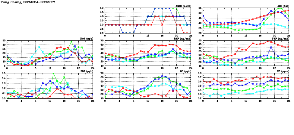 | Air Quality Data Time Series in Tung Chung (2025/10/27) | ( Line colors: Day -3 Day -2 Day -1 Current day ) | 2D Map Current AQHI |