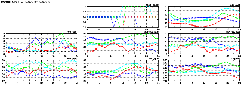 | Air Quality Data Time Series in Tseung Kwan O (2025/10/29) | ( Line colors: Day -3 Day -2 Day -1 Current day ) | 2D Map Current AQHI |