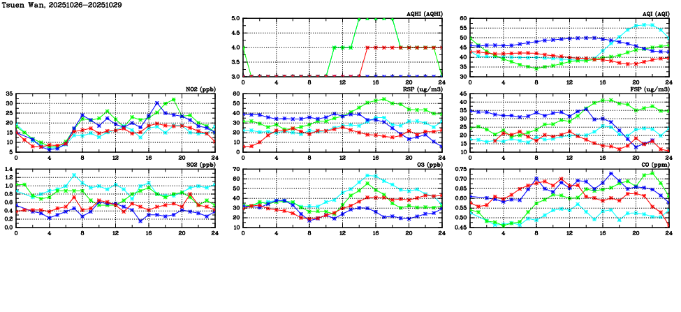 | Air Quality Data Time Series in Tsuen Wan (2025/10/29) | ( Line colors: Day -3 Day -2 Day -1 Current day ) | 2D Map Current AQHI |