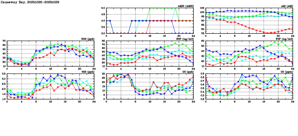 | Air Quality Data Time Series in Causeway Bay (2025/10/29) | ( Line colors: Day -3 Day -2 Day -1 Current day ) | 2D Map Current AQHI |