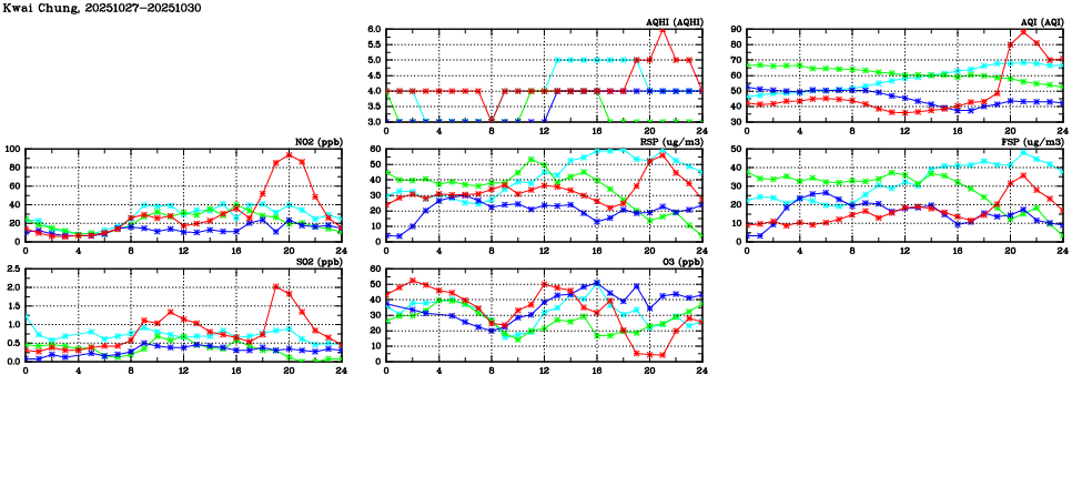 | Air Quality Data Time Series in Kwai Chung (2025/10/30) | ( Line colors: Day -3 Day -2 Day -1 Current day ) | 2D Map Current AQHI |