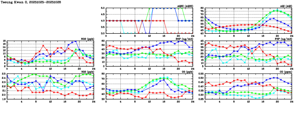 | Air Quality Data Time Series in Tseung Kwan O (2025/10/28) | ( Line colors: Day -3 Day -2 Day -1 Current day ) | 2D Map Current AQHI |