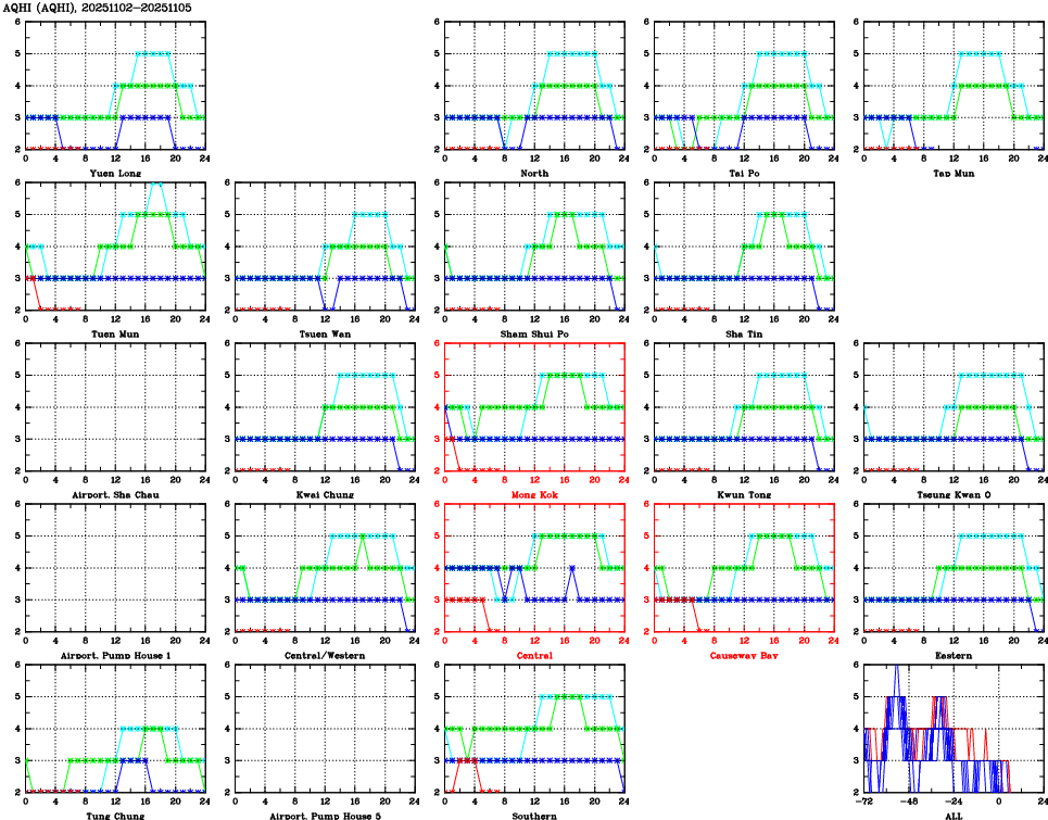 | Air Quality Data Time Series for AQHI (2025/11/05) | ( Line colors: Day -3 Day -2 Day -1 Current day ) | 2D Map Current AQHI |