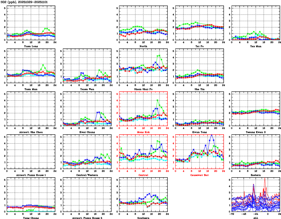 | Air Quality Data Time Series for SO2 (2025/11/01) | ( Line colors: Day -3 Day -2 Day -1 Current day ) | 2D Map Current AQHI |