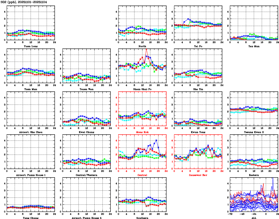 | Air Quality Data Time Series for SO2 (2025/11/04) | ( Line colors: Day -3 Day -2 Day -1 Current day ) | 2D Map Current AQHI |