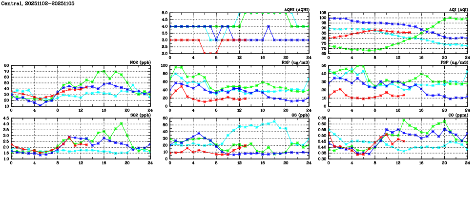 | Air Quality Data Time Series in Central (2025/11/05) | ( Line colors: Day -3 Day -2 Day -1 Current day ) | 2D Map Current AQHI |
