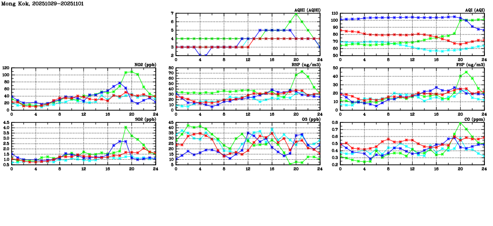 | Parameters: | AQHI | AQI | RSP | FSP | NO2 | SO2 | O3 | CO | Temp | WS | WD |