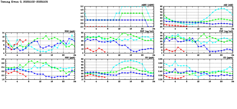 | Air Quality Data Time Series in Tseung Kwan O (2025/11/05) | ( Line colors: Day -3 Day -2 Day -1 Current day ) | 2D Map Current AQHI |