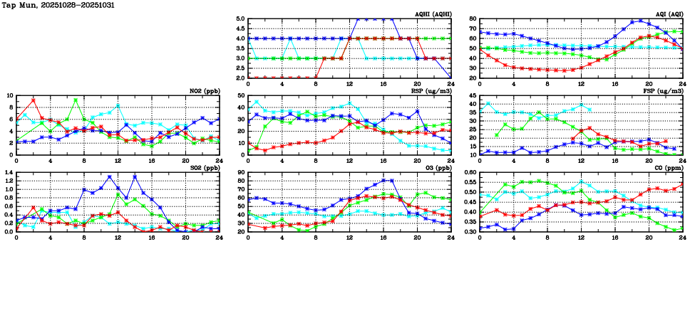 | Air Quality Data Time Series in Tap Mun (2025/10/31) | ( Line colors: Day -3 Day -2 Day -1 Current day ) | 2D Map Current AQHI |
