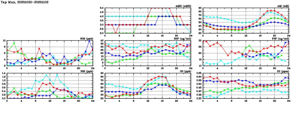| Air Quality Data Time Series in Tap Mun (2025/11/02) | ( Line colors: Day -3 Day -2 Day -1 Current day ) | 2D Map Current AQHI |
