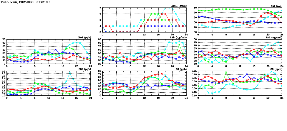 | Parameters: | AQHI | AQI | RSP | FSP | NO2 | SO2 | O3 | CO | Temp | WS | WD |