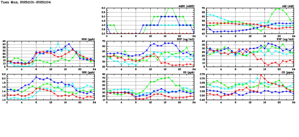 | Air Quality Data Time Series in Tuen Mun (2025/11/04) | ( Line colors: Day -3 Day -2 Day -1 Current day ) | 2D Map Current AQHI |