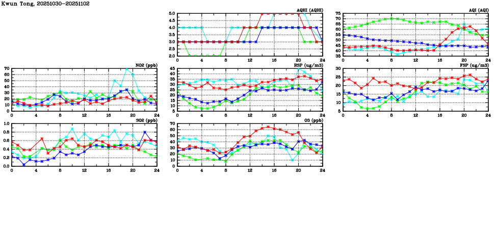 | Air Quality Data Time Series in Kwun Tong (2025/11/02) | ( Line colors: Day -3 Day -2 Day -1 Current day ) | 2D Map Current AQHI |