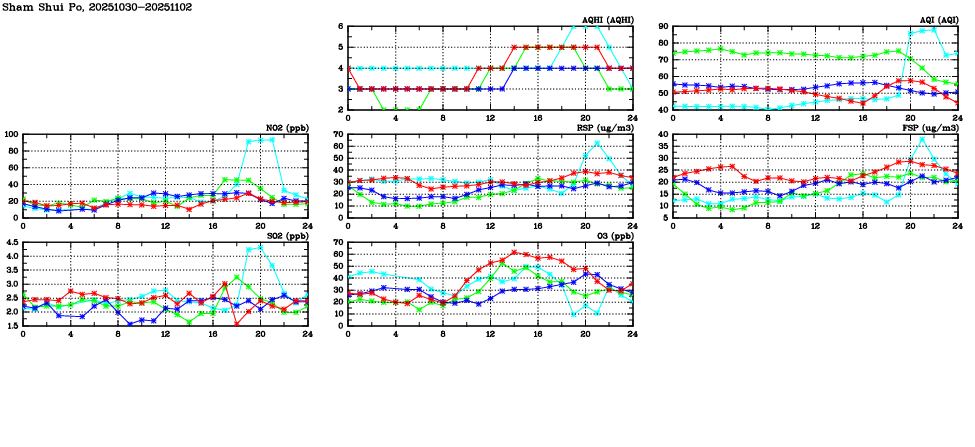 | Air Quality Data Time Series in Sham Shui Po (2025/11/02) | ( Line colors: Day -3 Day -2 Day -1 Current day ) | 2D Map Current AQHI |