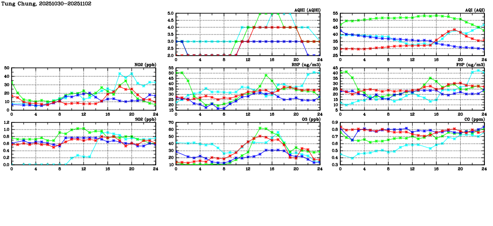| Air Quality Data Time Series in Tung Chung (2025/11/02) | ( Line colors: Day -3 Day -2 Day -1 Current day ) | 2D Map Current AQHI |