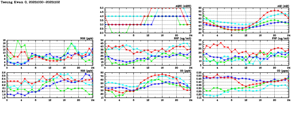 | Air Quality Data Time Series in Tseung Kwan O (2025/11/02) | ( Line colors: Day -3 Day -2 Day -1 Current day ) | 2D Map Current AQHI |