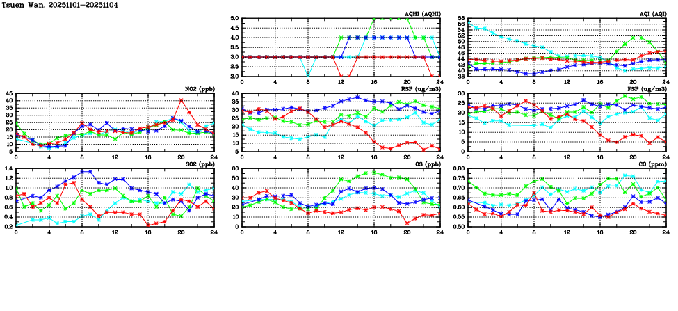 | Air Quality Data Time Series in Tsuen Wan (2025/11/04) | ( Line colors: Day -3 Day -2 Day -1 Current day ) | 2D Map Current AQHI |
