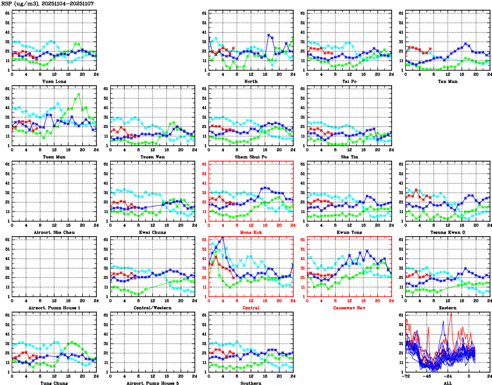 | Air Quality Data Time Series for RSP (2025/11/07) | ( Line colors: Day -3 Day -2 Day -1 Current day ) | 2D Map Current AQHI |