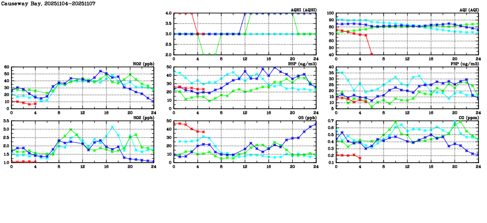 | Air Quality Data Time Series in Causeway Bay (2025/11/07) | ( Line colors: Day -3 Day -2 Day -1 Current day ) | 2D Map Current AQHI |