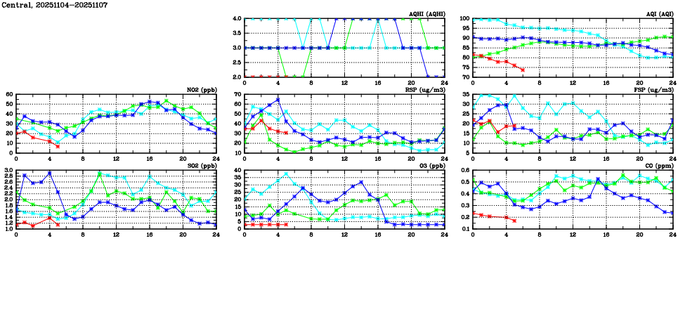 | Air Quality Data Time Series in Central (2025/11/07) | ( Line colors: Day -3 Day -2 Day -1 Current day ) | 2D Map Current AQHI |