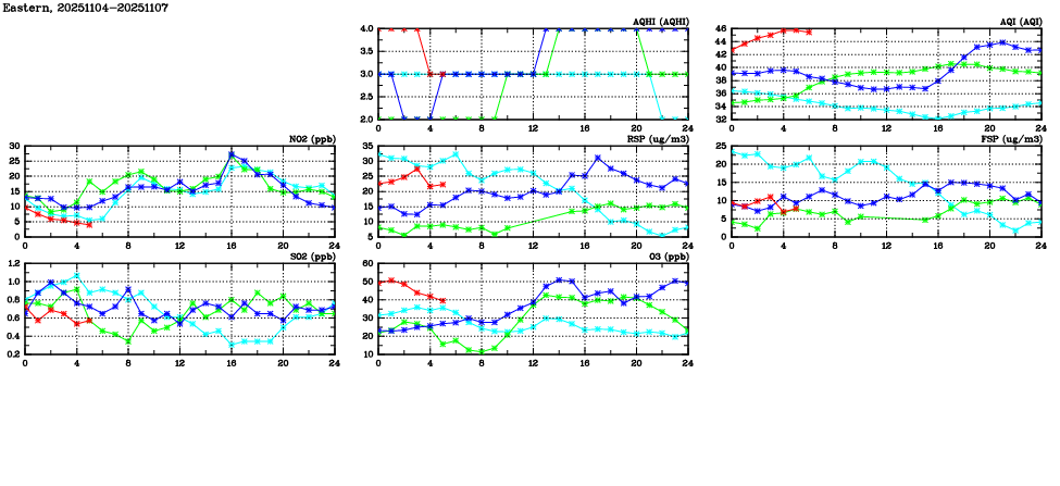 | Air Quality Data Time Series in Eastern (2025/11/07) | ( Line colors: Day -3 Day -2 Day -1 Current day ) | 2D Map Current AQHI |